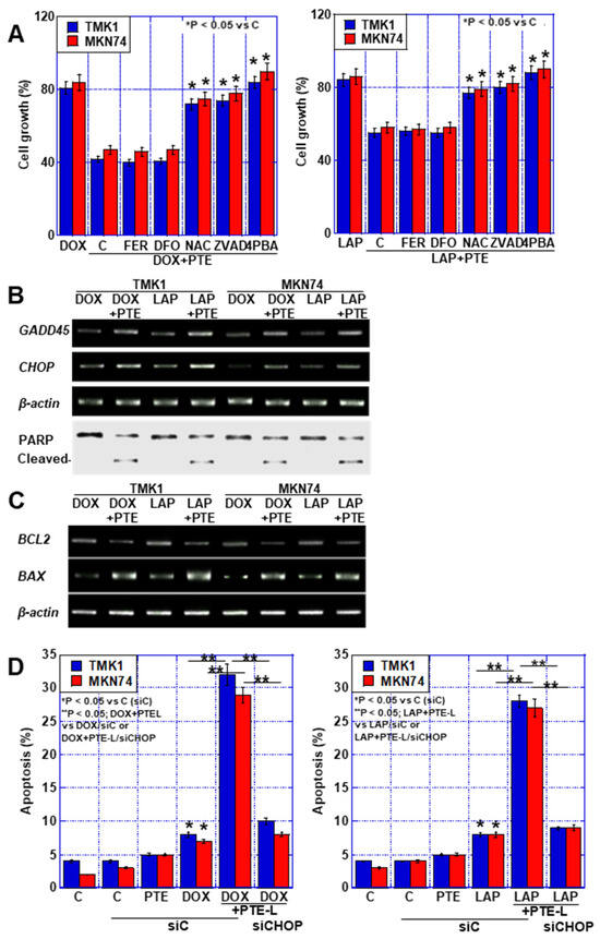 Cell death in GC cells treated with a combination of PTE-L and DOX or LAP. (A) Cell death inhibitor assay in GC cells exposed to concurrent treatment with PTE-L and DOX (IC20) (left) or PTE-L and LAP (IC 20) (right) * p < 0.05 vs. C. (B) ER stress-associated gene expression and PARP cleavage. (C) Expression of BCL2 and BAX. (D) Effect of CHOP knockdown on cell death caused by concurrent treatment with PTE-L and DOX (left) or LAP (right). * p < 0.05 vs. C (siC), ** p < 0.05; DOX+PTEL vs. DOX/siC or DOX+PTE-L/siCHOP (left), or ** p < 0.05; LAP+PTE-L vs. LAP/siC or LAP+PTE-L/siCHOP (right). Error bar, standard deviation from three independent trials. *,** Significance was calculated using ANOVA with Bonferroni correction.