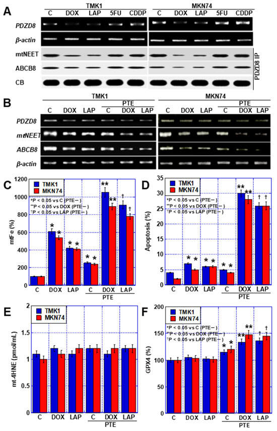 Next, the mechanism of mtFe deposition in GC cells by DOX and LAP was examined. We previously reported that PTE reduces PDZD8, a protein in MAM [11]. Therefore, we investigated the effects of the four anticancer drugs on PDZD8 expression (Figure 5A). PDZD8 expression was decreased by DOX and LAP (mtFe-depositing drugs), whereas no change was observed with 5FU and CDDP (mtFe-non-depositing drugs). Next, we investigated the expression of mitochondrial protein containing the Asn-Glu-Glu-Thr (NEET) sequence (mitoNEET; mtNEET) and that of the ATP-binding cassette subfamily B member 8 (ABCB8), which bind to PDZD8 and are involved in iron transport. In both cases, the levels of PDZD8-binding proteins decreased with the DOX and LAP treatment, whereas no changes were observed with the 5FU and CDDP treatment (Figure 5A). Furthermore, we examined changes in the mRNA levels of PDZD8, mtNEET, and ABCB8 when DOX and LAP were used alone or in combination with PTE-L (Figure 5B). The expression of PDZD8, mtNEET, and ABCB8 was decreased by treatment with DOX, LAP, and PTE-L alone, and was further decreased when each drug was combined with PTE-L. mtFe accumulation and apoptosis were increased by treatment with DOX, LAP, and PTE-L alone and were further increased when each drug was combined with PTE-L (Figure 5C,D). In contrast, mitochondrial lipid peroxidation (mt-4HNE) did not change with treatment with DOX, LAP, or PTE-L alone, or when the drugs were combined with PTE-L (Figure 5E). The expression of glutathione peroxidase (GPX)-4 protein, which plays an important role in mitochondrial redox, was increased after treatment with DOX, LAP, and PTE-L alone, and was further increased when each drug was combined with PTE-L (Figure 5F).