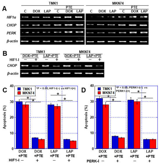 LAP, DOX, 5FU, CDDP (Wako), and PTE (Tokyo Chemical Industry Co., Ltd., Tokyo, Japan), echinomycin (HIF1α inhibitor, Abcam, Cambridge, UK), and GSK2656157 (PERK inhibitor, Selleck, Houston, TX, USA) were purchased. The cells were incubated for 48 h. The IC20s of the anticancer drugs were as follows: DOX, 0.13 and 0.1 µM; 7.8 and 8.0 µM; 5FU, 30 and 55 µM; CDDP, 2.0 and 2.3 µM in TMK1 and MKN74, respectively.