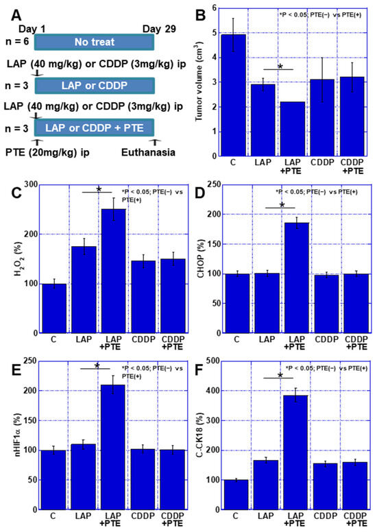 Effect of PTE on the antitumor effect of LAP and CDDP in a mouse tumor model. (A) Experimental protocol. TMK1 GC cells (1 × 107) were inoculated subcutaneously in mice. On day 1, LAP (40 mg/kg, ip) or CDDP (3 mg/kg, ip), with or without PTE (20 mg/kg, ip), was administered. On day 29, mice were euthanized. (B) Tumor volume on day 29, which was calculated according to the formula (minor axis2 × major axis) / 2. * p < 0.05; PTE(−) vs. PTE(+). (C–F) Using whole-cell lysates of the tumors, the following parameters were measured using enzyme-linked immunosorbent assay: H2O2 (C), CHOP (D), nHIF1α (E), and C-CK18 (F). * p < 0.05; PTE(−) vs. PTE(+). Error bar, standard deviation determined by the number of mice constituting each group. * Significance was calculated using ANOVA with Bonferroni correction. GC, gastric cancer; PTE, pterostilbene; C, no treatment; LAP, lapatinib; CDDP, cisplatin; CHOP, C/EBP homologous protein; nHIF, nuclear hypoxia-inducible factor; C-CK18, cleaved cytokeratin 18.