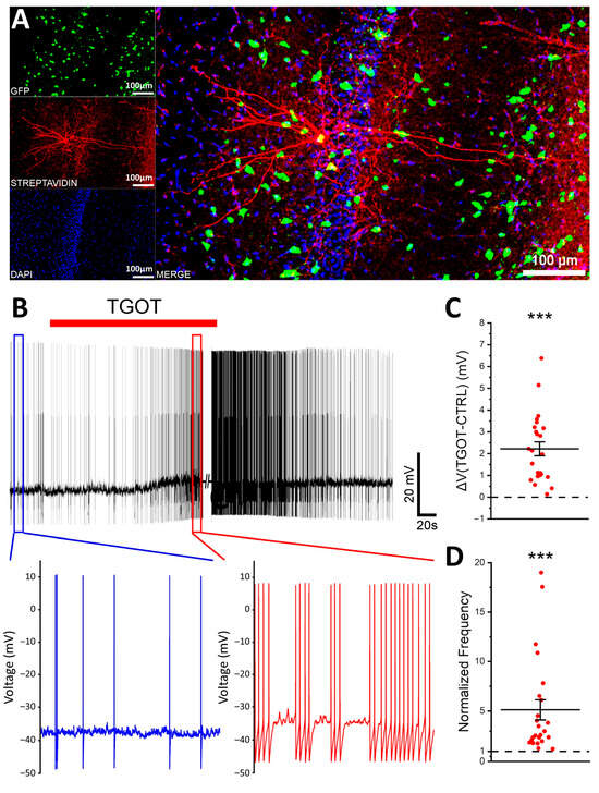 In a previous study, we demonstrated that the selective OTR agonist TGOT was able to depolarize and increase the firing frequency of specific CA1 OTR-expressing GABAergic INs [19]. Similar results were obtained by Owen et al. [20]. Here, we aimed at identifying the multiple modulations exerted by 1 µM TGOT on the CA1 OTR-expressing GABAergic INs. To selectively record from the GABAergic INs of the stratum pyramidale, in our experiments, we used a murine model featuring GABAergic INs labeled with GFP (GAD67-GFP+ (Δneo) mice). The location and the GABAergic identity of the recorded cells were confirmed a posteriori through biocytin labeling and imaging of the recorded cells, together with the intrinsic fluorescence of GAD67-GFP+ neurons (Figure 1A). To select the cells directly responding to the TGOT administration, we relied on the experimental procedures reported in the literature [19,20]. Specifically, we recorded 24 TGOT-responding CA1 GABAergic INs from 18 mice, the majority of which, based on their firing mode, were fast-spiking interneurons (FS-INs, N = 14/24). They showed a membrane capacitance (Cm) of 64.1 ± 3.9 pF, an input resistance (Rin) of 210 ± 19 MΩ, and a membrane resting potential (Vr) of −71.3 ± 1.2 mV. By analyzing the effect of OTR activation on their membrane potential at the firing threshold, we found that the bath perfusion of 1 µM TGOT determined a depolarization of +2.22 ± 0.32 mV (p < 0.001) (Figure 1B,C) and a significant increase in the firing rate by a factor of 5.12 ± 1.01 (p < 0.001) (Figure 1B,D), as expected.