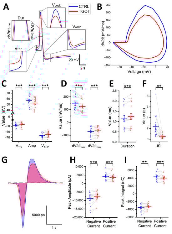 LMMs confirmed a significant effect of TGOT on Vthr, Amp, VAHP, dV/dtmax, dV/dtmin, Dur, and ISI.