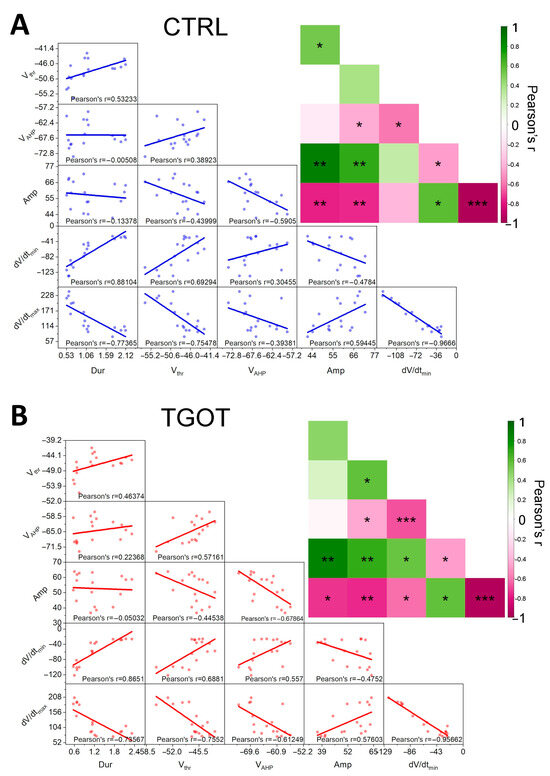 Many of the parameters that define the shape of the APs are intrinsically related to each other. We used Pearson correlation analysis to clarify the specific direct or inverse correlations between them. Being in the presence of repeated observations (i.e., 10 APs in CTRL and 10 APs in TGOT) for the same subject (i.e., cell), we computed the correlations at the subject level (i.e., we used the averages for each subject) to eliminate the subject effect in repeated measures [30,31]. Starting from the data obtained in control conditions (N = 17 cells from 12 mice), we plotted pairwise scatterplots of Vthr, Amp, VAHP, dV/dtmax, dV/dtmin, and Dur (Figure 4A). Then, we calculated the Pearson correlation coefficients for each of them (Figure 4A inset). The same analyses were repeated for data derived in the presence of TGOT (Figure 4B). We found that the correlation matrices obtained in control and TGOT conditions were quite similar, although correlations were generally stronger under TGOT conditions. We managed to adequately interpolate virtually all the pairwise scatterplots with regression lines and found highly significant direct or inverse correlations in most of the parameters describing the AP shape (Figure 4), as expected. While describing the presence of correlations between the parameters, this analysis is inadequate for identifying causal dependencies between them and could not highlight the effect of TGOT in inducing variations in the associated variables. So, for a more coherent analysis and interpretation of the data, we relied on LMMs.