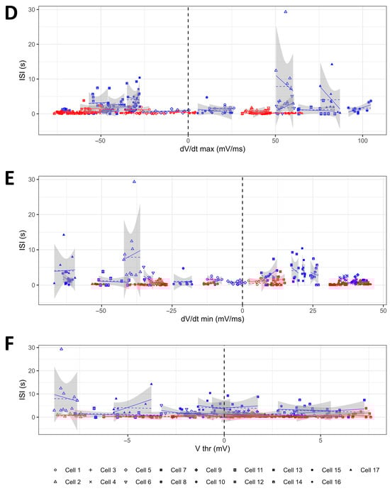 To correlate the parameters describing the AP waveform with the firing frequency, a one-to-one correspondence between the parameters to be compared would be needed. Therefore, for this purpose, we evaluated the firing frequency by computing the interspike intervals (ISIs) between the contiguous APs used in the phase plot analysis, which are the inverse of the instantaneous firing frequency.
