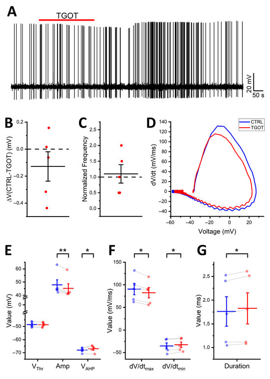 Under these conditions, we observed an evident effect on the peak of the APs during the bath perfusion of 1 µM TGOT, which was, however, reversed upon the wash out of the drug (decrease in Vpeak in TGOT compared to the CTRL of 3.53 ± 1.58 mV vs. increase in Vpeak in WASH compared to TGOT of 1.36 ± 0.61 mV; N = 5; p < 0.05) (Figure 7A). Importantly, the membrane potential remained relatively stable during the long recording (p > 0.05), confirming the efficacy of the recording protocol (Figure 7B), and the firing rate did not vary (p > 0.05) (Figure 7C). Significant changes in the AP shape during TGOT perfusion became evident through the phase–plane plot analysis (Figure 7D). Specifically, AP Amp was significantly reduced (47.8 ± 3.9 mV in the CTRL, reduced to 45.2 ± 3.6 mV in TGOT; p < 0.01), and VAHP was modulated toward less-hyperpolarized values (−68.0 ± 0.8 mV in the CTRL vs. −66.9 ± 1.2 mV in TGOT; p < 0.05) (Figure 7E). On the other hand, Vthr remained unchanged (−48.6 ± 1.0 mV in CTRL vs. −48.6 ± 1.0 mV in TGOT; p > 0.05) (Figure 7E). We hypothesized that this parameter could be directly influenced by the TGOT-induced membrane depolarization and by the resultant increase in firing rate, due to the dynamic spike threshold phenomenon. This phenomenon involves a dynamic depolarization of Vthr during sustained firing at high frequency [34,35,36]. Consequently, it would be consistent for Vthr to not change during TGOT perfusion under this particular experimental protocol where the membrane potential and the firing rate were held constant. The dV/dtmax shifted from 91 ± 13 mV/ms to 83 ± 11 mV/ms (CTRL vs. TGOT; p < 0.05) and the dV/dtmin from −35.2 ± 6.6 mV/ms to −32.5 ± 6.2 mV/ms (CTRL vs. TGOT; p < 0.05) (Figure 7F), confirming a slowdown of AP kinetics induced by TGOT. Accordingly, AP Dur increased in the presence of TGOT (1.76 ± 0.31 ms in the CTRL vs. 1.83 ± 0.33 ms in TGOT; p < 0.05) (Figure 7G).