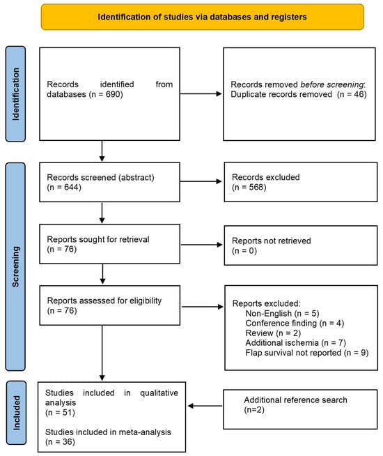The initial literature search yielded 690 papers, reduced to 644 after deduplication. After abstract screening, 76 articles were eligible for full-text retrieval. Eventually, 51 studies [,,,,,,,,,,,,,,,,,,,,,,,,,,,,,,,,,,,,,,,,,,,,,,,,,,] were included in the qualitative synthesis (Table 1), of which 36 studies with 1576 rats were analyzed quantitatively (Figure 1).