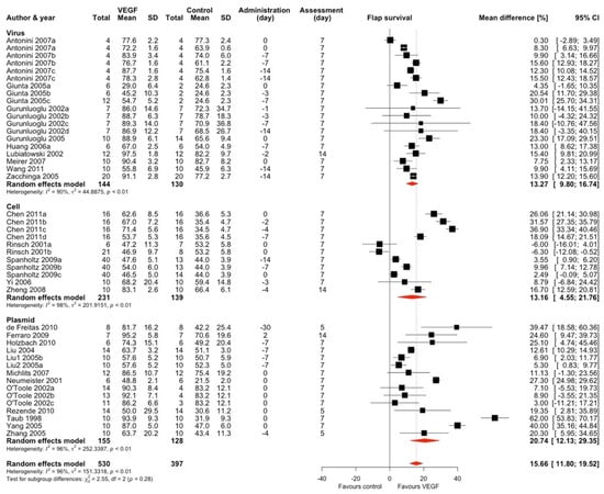 The authors used VEGF as an intervention in 27 studies and 45 comparisons (Figure 2) [,,,,,,,,,,,,,,,,,,,,,,,,,,]. Eight studies used viruses as vectors, five used cells, and 13 used plasmids. The overall effect estimate for this intervention was a mean increase in flap survival area of 15.66% (95% CI 11.80–19.52), and the results were highly heterogeneous (I2 = 96%).