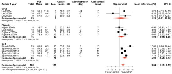 This intervention was used in 6 studies and 12 comparisons (Figure 3) [,,,,,]. One study used viruses as vectors, three used plasmids, and two used cells. Interventions with FGF, on average, increased the flap survival by 3.84% (95% CI 1.13–6.55), and there was considerable heterogeneity between studies (I2 = 87%). This effect diminished and became insignificant after sensitivity analyses.