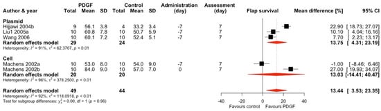 | Spanholtz; 2011 (*) [49] | FGF-β (I) VEGF-165 (II) | Cells (transfection) | Transient (baseline expression at day 14) | 5 x106 cells (*) 1 × 107 cells(**) | Sham-modified fibroblasts (compared here) Non-modified fibroblast Cell medium only | 14 days | McFarlane | 320 Sprague–Dawley female rats (200–225 g) | Subdermal injections 7 days or 14 days (1, 2) before flap elevation within flap alone (*) and in flap surrounding and flap (**) | 1 *—51.02 ± 2.96 2 *—51.90 ± 1.43 1 **—52.79 ± 3.01 2 **—51.56 ± 1.43 | I + II * 1—58.76 ± 1.70 I + II * 2—60.38 ± 2.77 I + II ** 1—59.20 ± 2.17 I + II ** 2—62.16 ± 1.38 I * 1—53.48 ± 1.72 I * 2—54.22 ± 2.21 I ** 1—60.53 ± 1.68 I ** 2—57.57 ± 2.15 |