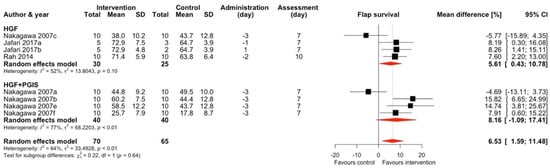Hepatocyte growth factor alone or enriched with prostacyclin synthase was used in three studies and four comparisons, and one study and four comparisons, respectively (Figure 5) [,,]. Sole HGF treatment increased flap survival by an average of 5.61% (95% CI 0.43–10.78) with moderate heterogeneity (I2 = 52%). An addition of PGIS insignificantly increased flap survival to an average of 8.16% (95% CI −1.09–17.41). Overall, any therapy containing HGF increased flap survival by an average of 6.53% (95% CI 1.59–11.48) with a substantial heterogeneity of included studies (I2 = 64%).