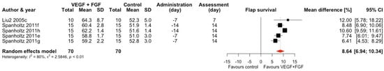 Combined therapy with VEGF and FGF was used in 2 studies and 5 comparisons (Figure 6) [,]. On average, it increased flap survival by 8.64% (95% CI 6.94–10.34) with considerable heterogeneity (I2 = 80%).