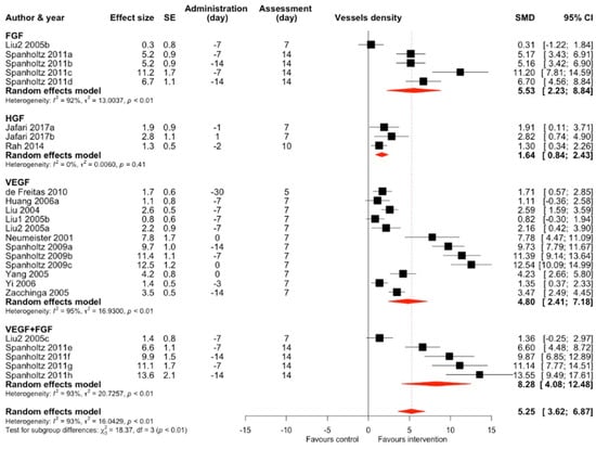 The authors measured vessel density using a variety of methods in 13 studies and 35 comparisons (Table S3) [,,,,,,,,,,,,]. The overall effect estimate for all intervention types was an increase in standardized mean difference of 5.25 (95% CI 3.62–6.87), results were considerably heterogeneous (I2 = 93%), and intervention subgroups differed (p < 0.01) (Figure 7).