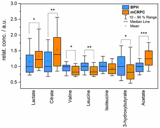 - Giskeødegård, G.F.; Hansen, A.F.; Bertilsson, H.; Gonzalez, S.V.; Kristiansen, K.A.; Bruheim, P.; Mjøs, S.A.; Angelsen, A.; Bathen, T.F.; Tessem, M.-B. Metabolic markers in blood can separate prostate cancer from benign prostatic hyperplasia. Br. J. Cancer 2015, 113, 1712–1719. [Google Scholar] [CrossRef] [PubMed]