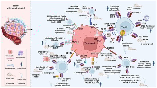 Although CAR T cells can reach tumor sites successfully, their ability to exhibit anti-tumor effects is hindered. Only a limited number of cells demonstrate efficacy due to the prevailing immunosuppressive microenvironment. This environment is characterized by various inhibitory factors, including metabolic elements, inflammatory factors, immunosuppressive cells, and immune checkpoints. Thus, consideration should be given to gene editing against immune checkpoints on TAA CAR T cells, coupled with targeted drugs to negate the tumor’s immunosuppressive microenvironment and to improve the local metabolism [,,]. This intricate network collectively diminishes HCC growth through inhibition of T cell attacks.