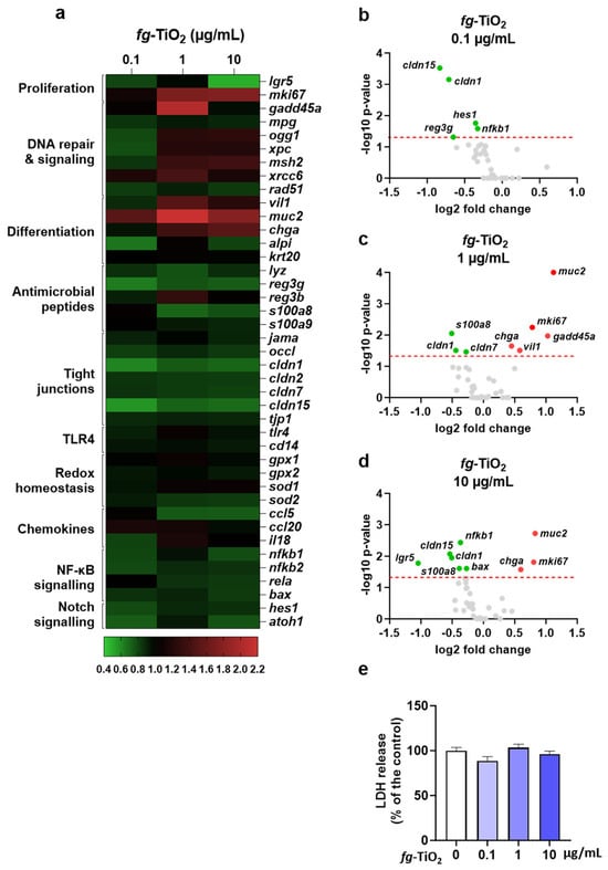 Differential expression of genes involved in the maintenance of the gut barrier after exposure of EDMs to fg-TiO2. (a) Heat map showing differential gene expression in EDMs exposed for 24 h to fg-TiO2 at 0.1, 1, and 10 µg/mL, compared to control. Red and green shadings represent higher and lower relative expression levels, respectively. (b–d) Volcano plot illustrating significantly different genes expressed in EDMs exposed for 24 h to fg-TiO2 at 0.1 (b), 1 (c), and 10 (d) µg/mL. Red and green dots represent significant (p < 0.05) higher and lower relative expression levels, respectively. Grey dots represent no significant change in relative expression levels. The red dashed line shows statistical significance threshold (adjusted p-values ≤ 0.05). (e) LDH release of EDMs exposed to fg-TiO2 at 0, 0.1, 1, and 10 µg/mL, where data are presented as the mean ± SEM of three independent experiments, each with four to six EDMs per group. Note that no significant LDH release was observed (Kruskal–Wallis test followed by post hoc Dunn’s multiple comparison test).