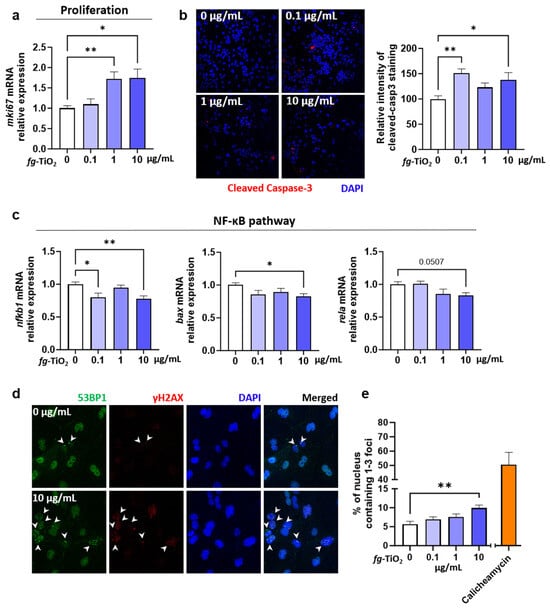 Effect of fg-TiO2 exposure on cell proliferation, apoptosis, and genotoxicity in EDMs exposed to fg-TiO2 at 0, 0.1, 1, and 10 µg/mL for 24 h. (a) Relative expression of mki67 gene. (b) Immunofluorescence staining of cleaved caspase-3 (20× magnification) and the histogram showing the relative intensity staining compared to control. (c) Relative expressions of genes involved in NF-κB pathway. (d) Immunofluorescence staining of γH2AX and 53BP1 (20× magnification), white arrows pointing foci of γH2AX and 53BP1). (e) Percentage of nucleus containing 1–3 foci of γH2AX and 53BP1. EDMs exposed to calicheamycin γ-1 was used as positive control. Data are presented as the mean ± SEM of three independent experiments, each with four to six EDMs per group. * p < 0.05 and ** p < 0.01 using one-way ANOVA followed by post hoc Dunnett’s multiple comparison test (e) or nonparametric Kruskal–Wallis test, followed by post hoc Dunn’s multiple comparison test (a–c).