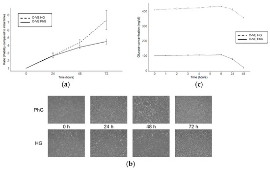 Then, we decided to measure the glucose media concentration for 48 h of the cell culture, and observed that after this time, glucose in the PhG media was totally consumed, while in the HG media, glucose concentrations, although being reduced, remained higher than 300 mg/dL (Figure 1c).