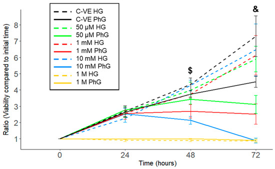 hTERT RPE-1 cell viability time course comparing the different concentrations of metformin (1 M, 10 mM,1 mM, 50 µM) under both conditions of glucose (N = 3). PhG: physiological glucose; HG: high glucose; C-VE: negative control. ($: p = 0.020; &: p = 0.012; 10 mM PhG vs. 10 mM HG).