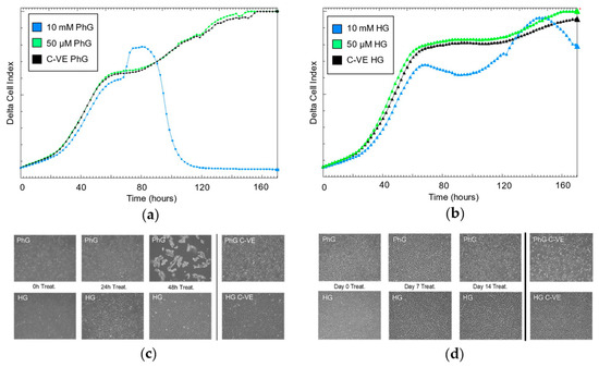 Continuous cell proliferation rate registry by iCelligence under two concentrations of metformin (10 mM, 50 µM) (a) and physiological (b) and high concentrations of glucose (N = 3). Cell culture of hTERT RPE-1 (magnification: 50×) under the two concentrations of glucose and for (c) 10 mM of metformin and (d) 50 µM of metformin. PhG: physiological glucose; HG: high glucose; C-VE: negative control.