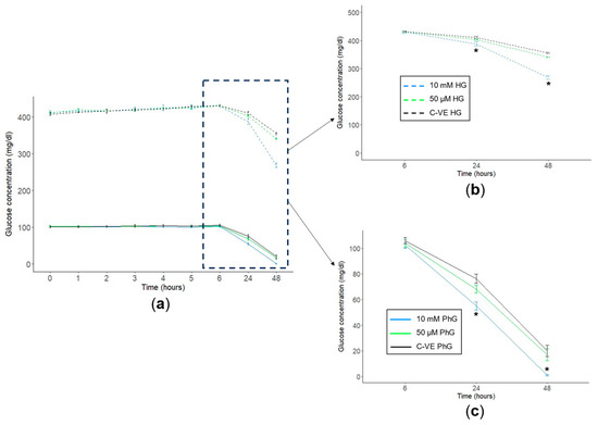 Glucose consumption time course. (a) Cell supernatant glucose consumption time course for the two concentrations of glucose. Cell supernatant glucose concentration at 6 h, 24 h and 48 h of (b) high and (c) physiological concentration culture media for the different concentrations of metformin (C-VE, 10 mM, 50 µM) (N = 3). PhG: physiological glucose; HG: high glucose; C-VE: negative control. * p < 0.05 (10 mM vs. C-VE).