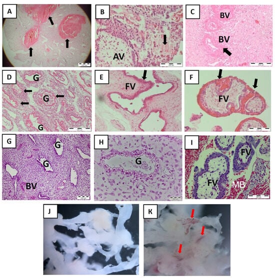 Maternal–fetal interface and explanted placental villi in MA (A–F,J) and normal early pregnancy (G–I,K). (A–F): MA decidua with massive blood cloths (black arrow, A) and anchoring villa and blood vessels with necrotic tissue (black arrow, (B) and (C), respectively). Note the destroyed decidual glands with massive immune infiltration around (D). The placental villi are immature, inflamed, and irregular in shapes (black arrow, E), showing numerous clots (black arrow, F). Representative images for n = 10. Explanted placental villi derived from aborted pregnancy (J, n = 3) are not vital, and they are shown by a lack of blood vessels which are numerous in explanted normal placental villi (red arrows, K). (G–I): Healthy decidua with normal glands and blood vessels (G,H) as well as floating mature placental villi bathed in the maternal blood into intervillous spaces (I). Representative images for n = 10. Hematoxylin and eosin staining. BVs—blood vessels, G—gland, AV—anchoring villa, FV—floating villi, MB—maternal blood. Scale bar represents 200 μm (A,C,F,G,H) and 100 μm (B,D,I). Magnification 4× (J,K) and 10× (E).
