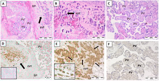 The presence of EVT cells in the basal plate of full-term placenta. (A)—full-term placenta and EVT cells (black arrow) in its basal plate; (B)—EVT at higher magnification; (C)—placental villi; (D)—HLA-G-positive EVT in the basal plate of the placenta (black arrow); (E)—HLA-G+ EVT cells (black arrows) at higher magnification; the inset shows round-shape stationary EVTs with endoduplication; (F)—HLA-G-negative placental villi. (A–C)—hematoxylin and eosin staining. (D–F)—detection of HLA-G; an inset of (D) is a negative control staining. PV—placental villi, BP—basal plate, EVTs—extravillous trophoblasts. Representative images of n = 5. Scale bar represents 200 μm (A,C,D) and 100 μm (B,E,F). The scale bar of the inset of (D) correspond to that of the main image, the scale bar of the inset of (E) is 20 μm.