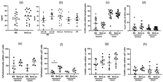 Since normal early pregnancy is generally associated with the down-regulation of the adaptive immune system (conventional T-cell responses) and specific adaptations of the innate immune cell populations at the MFI, our focus was on T cells, unconventional subset γδ T cells, and their potential for cytotoxicity. Our FACS analysis of total T-cell proportion in the blood and decidua of MA women compared to those with normal early pregnancy showed no significant difference either in the numbers of decidual T cells (p = 0.6158) or of peripheral blood T cells (p = 0.4071, Figure 4c). No difference was observed in the number of peripheral blood and decidual γδT cells either (p = 0.8450, p = 0.0683, respectively, Figure 4d). To evaluate the cytotoxic potential of conventional (αβ) and non-conventional (γδ) T cells, we examined the intracellular expression of the pore-forming molecule perforin and cytotoxic granzyme B. Although showing relatively high cytotoxic potential, γδ T cells in the MA decidua did not produce more perforin and granzyme B as compared to those in normal decidua (p = 0.3095 and p = 0.1139, respectively, Figure 4e,g). The same results were found for peripheral blood γδ T cells positive for perforin or granzyme B in both groups (p = 0.1429 and p = 0.2721, respectively, Figure 4e,g). While the levels of peripheral blood perforin+αβT cells+ were comparable in both groups (Figure 4f), in the aborted decidua αβ T cells positive for perforin had a lower number (p = 0.0159, Figure 4f). No difference was found in the proportion of αβT cells positive for granzyme B either in the decidua (p = 0.1949) or in the blood (p = 0.8518) between women experiencing missed abortions and those experiencing normal pregnancies (Figure 4h).