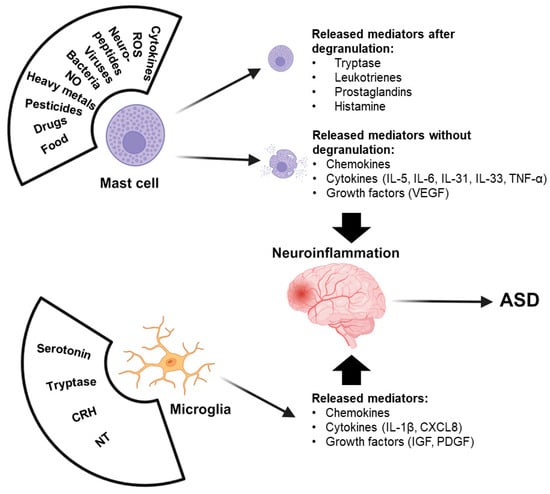 MCs are located perivascularly in all tissues, including the brain, where they are adjacent to CRH-positive nerve endings []. They are also plentiful in the meninges []. Studies have found that the stimulation of MCs leads to activation of microglia, which are actually involved in ASD [] (Figure 1). In addition, MCs are also implicated in the regulation of the hypothalamus–pituitary–adrenal (HPA) axis in the skin [] and brain [], as histamine, IL-6 [] and CRH [] can activate this axis. MCs are usually stimulated by exposure to allergens and binding of IgE to high-affinity receptors (FcERIs), whose aggregation leads to degranulation and the secretion of multiple pre-stored and newly synthesized mediators [,]. In addition to IgE, many substances from the environment, gut or brain can induce MC activation []. MCs can serve as sensors of environmental and psychological stress [], releasing danger signals [] such as mitochondrial DNA (mtDNA) [], which acts as an “innate pathogen” [], causing autoinflammatory responses []. It is found to be increased also in the serum of children with ASD []. MCs can secrete exosomes that deliver miRNAs [] and may be involved in brain pathology [].