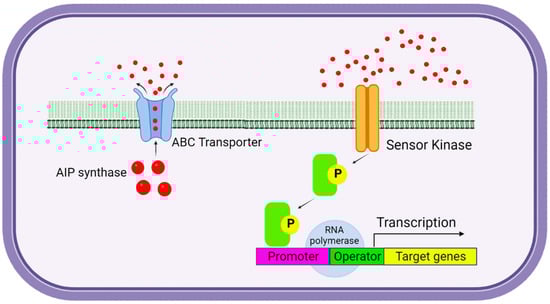 | AIP | Staphylococcus aureus | AgrD/AgrC | Virulence production, exotoxins, and biofilm dispersal [95,97,99] |