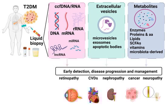 Biomarkers that allow for early diagnosis and effective monitoring have the potential to lead to better patient-centric therapeutic decisions. In T2D, identifying the precise timing of critical events such as β-cell stress, de-differentiation, or death is essential for developing effective treatments [8]. However, the inaccessibility of pancreatic tissue in humans for longitudinal, minimally invasive monitoring represents a significant obstacle. To address this shortcoming, liquid biopsy could be employed for the detection of β-cell markers. Liquid biopsies encompass a diverse range of clinically informative elements. Blood samples can undergo analysis for metabolites, exosomes, and cell-free nucleic acids, each offering valuable numerical and molecular insights. Employment of liquid biopsy in T2D patients can provide valuable insight regarding T2D complications, cardiovascular disease (CVD), and cancer risk. An overview of the key elements and the impact of the liquid biopsy markers in T2D is presented in Figure 1.