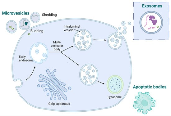 EVs are classified based on their different sizes and biogenesis processes (Figure 2). The main types of EVs are microparticles (MPs), exosomes, and apoptotic bodies, each with distinct characteristics [40]. MPs that are also known as microvesicles or ectosomes originate from the outward budding or shedding of the plasma membrane of cells and have a diameter size range from 30 nm to approximately 1 μm. Exosomes originate from the inward budding of endocytic vesicles within the cell, forming early endosomes which mature into late endosomes, also known as multivesicular bodies (MVBs), where intraluminal vesicles (ILVs) are formed through the inward budding of the endosomal membrane. Exosomes are released when MVBs fuse with the cell’s plasma membrane, leading to the extracellular release of the ILVs as exosomes. Exosomes are generally smaller, typically ranging from 30 to 150 nm in diameter. Apoptotic bodies are distinct from MPs and exosomes in terms of their origin and are typically larger than MPs and exosomes [41].