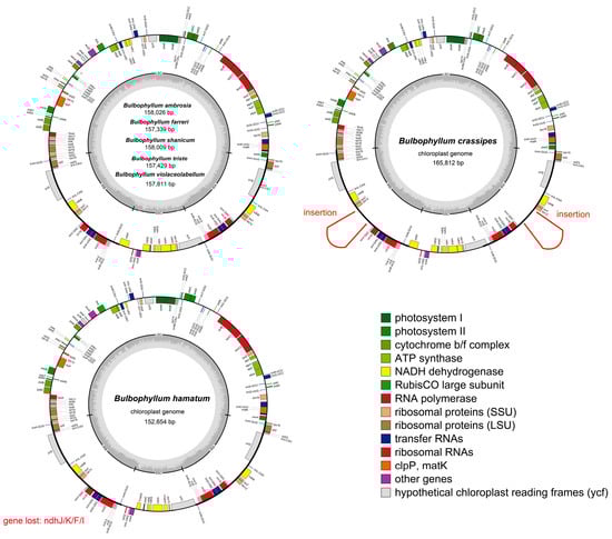 - Wen, Y.; Qin, Y.; Shao, B.; Li, J.; Ma, C.; Liu, Y.; Yang, B.; Jin, X. The extremely reduced, diverged and reconfigured plastomes of the largest mycoheterotrophic orchid lineage. BMC Plant Biol. 2022, 22, 448. [Google Scholar] [CrossRef] [PubMed]