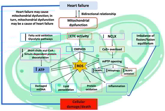 The heart is an organ with high energy demand which contains, at the cardiomyocyte level, an elevated concentration of mitochondria that are responsible for oxidative metabolism and the majority (95%) of ATP production [1]. Mitochondrial dysfunction occurs in patients with heart failure (HF) and is associated with a maladaptive response and a progressive decline in bioenergetic reserve capacity irrespective of the etiology of the disease [2]. Neurohormonal dysfunction, systemic inflammation, and cell stress contribute to mitochondrial dysfunction in HF, with a consequent increase in reactive oxygen species (ROS) production, nitric oxide synthase (NOS) uncoupling, and altered cellular calcium regulation. These molecular mechanisms contribute to cellular apoptosis, fibrosis, and cardiomyocyte hypertrophy finally leading to cardiac remodeling and HF development [3,4,5].