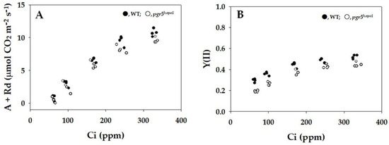In pgr5hope1, non-photochemical quenching (NPQ) was observed to be lower compared to WT, as depicted in Figure 3. The induction of NPQ requires acidification of the luminal side of thylakoid membranes [33,43]. Consequently, the lower ΔpH in pgr5hope1 may explain the inability to induce higher NPQ. On the contrary, the behavior of NPQ in WT in response to both the increase in the gross CO2 assimilation rate and the photosynthetic linear electron flow rate mirrored that of pgr5hope1 (Figure 3). NPQ decreased with the rise in both the gross CO2 assimilation rate and the photosynthetic linear electron flow rate, despite ΔpH remaining unchanged in both WT and pgr5hope1, as described earlier. NPQ is also influenced by the reduction–oxidation state of PQ and Y(II) [44,45]. Consequently, NPQ decreased with increases in both qP and Y(II).