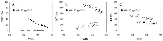 In Figure 2, the relationships between the parameters P700+, PC+, and Fd− and Y(II) were depicted. As Y(II) decreased due to lowering Ci, P700 in WT was oxidized, increasing from approximately 10% to 40% (see Figure 2A). In contrast, P700 in pgr5hope1 was not oxidized even as Y(II) decreased (Figure 2A). Similarly, PC in WT was oxidized, ranging from 65% to 90% (Figure 2B). Conversely, the oxidized PC percentage decreased from 20% to 5% with the decrease in Y(II) in pgr5hope1 (Figure 2B). Unlike P700+ and PC+, Fd− in WT did not show significant changes in response to the decrease in Y(II) (Figure 2C), attributed to the oxidation of P700 in PSI [19]. In contrast, Fd− in pgr5hope1 surpassed that in WT and increased from 40% to 55% with the decrease in Y(II) (Figure 2C). This elevation was attributed to the suppression of P700 oxidation in pgr5hope1, leading to an enhanced electron flux toward the acceptor side of PS I, ultimately resulting in the reduction of Fd [19].