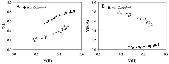 To delve deeper into this relationship, a statistical comparison was conducted between the dependence of Y(NA) on the reduced state of Fd in WT and pgr5hope1 (Supplemental Figure S5). ANCOVA analysis revealed a significant interaction between plants (WT and pgr5hope1) and the reduced Fd (p < 0.01). Subsequently, correlation analysis between Y(NA) and the reduced Fd was performed for each plant. In WT, ANOVA of the regression analysis showed no significant relationship between Y(NA) and the reduced Fd. However, in pgr5hope1, ANOVA of the regression analysis demonstrated a significant relationship between Y(NA) and the reduced Fd (F value 35.29, p < 0.01). The regression line was Y(NA) = −0.0717 + 0.01589** × Fd- (** p < 0.01), indicating a significant slope. Thus, the correlation between Y(NA) and the reduced Fd was observed exclusively in pgr5hope1.