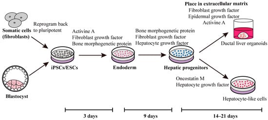 One approach involves employing self-renewal factors to reprogram fibroblasts or blastocysts into iPSCs or ESCs. During the initial three days, activin A, fibroblast growth factor, and bone morphogenetic protein are introduced to prompt stem cell differentiation towards the endoderm lineage. Subsequently, over the following six days, fibroblast growth factor, bone morphogenetic protein, and hepatocyte growth factor are administered to facilitate the differentiation of hepatic progenitors. Ultimately, this process yields ducted liver organoids or hepatocyte-like cells, achieved through the influence of various stimulating factors [,,,,].