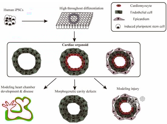 iPSC-derived cardiac organoids mimics heart disease and physiological and pathological processes. iPSCs are widely differentiated into cardiac organoids in pore plates, which are used to simulate heart disease. Cardiac organoids with different cellular compositions are used for the study and exploration of different disease mechanisms or normal physiological processes, including injury, heart chamber development, and morphogenetic cavity defects.