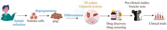 Traditional iPSC-derived 2D cell culture systems have been shown to be an incredibly useful resource, yielding vital insights and lowering the cost of disease modeling techniques []. However, the primary drawback of iPSC-derived 2D cell lines is that they are unable to replicate the cellular functions found in tissues due to their lack of cellular variety, dimensionality, hierarchical structure, and cell–cell or cell–matrix interactions []. Scientists contend that the complexity of human organs is not captured by 2D models, necessitating the development of more medically accurate models []. Over the past decade, iPSC technology has advanced significantly. When coupled with recent breakthroughs in gene editing and 3D organoid development, iPSC-based platforms have gained enhanced capabilities for drug screening. As shown in Figure 3, this approach is gaining widespread popularity, driven by the growing interest in phenotypic screening and the distinct advantages offered by human iPSCs compared to traditional cellular screening methods.