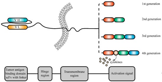 T cells are the main force in the fight against tumors and can recognize MHC molecules on the cell surface. These immune cells can be divided into two broad classes according to the different mechanism of effect, namely, CD4+ T cells and CD8+ T cells. CD4+ T cells recognize MHC Class II molecules to regulate the immune system. By contrast, CD8+ T cells recognize MHC Class I molecules and exert cytotoxicity directly, killing alien cells. Clinically, T cell adoptive cell therapy can treat some cancers [,,,,], however, for patients with refractory tumors, the therapeutic effect of this approach is minimal. In order to solve this problem, researchers have long found that engineered T cells are a new strategy for the treatment of recurrent and refractory tumors [,,], especially chimeric antigen receptor T cells (CAR-T) [,,,,]. Chimeric antigen receptors (CARs) are engineered proteins designed to guide T cells to target cancer cells. (The structure of the chimeric antigen receptor is shown in Figure 4 below). In preclinical models, adoptive transfer of stem-like CAR-T cells produced improved tumor control and resistance to tumor rechallenge []. In xenograft models, CAR-CD3+CD4−CD8− T cells demonstrated efficient infiltration and tumor suppression against lung cancer genetically engineered to produce CD19, as well as antigen-specific cytotoxicity against B cell acute lymphoblastic leukemia []. Thus, the design of CAR-T cell therapy is feasible and effective in clinical cancer treatment.