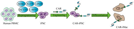 CAR-expressing iPSCs can differentiate into CAR-macrophage cells. The overview of deriving CAR-iMacs from CAR-iPSCs.
