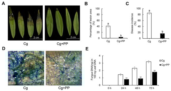 To test the effects of phloretin and pterostilbene on the leaves of stylo against anthracnose, we applied the combination treatment of phloretin and pterostilbene (PP) with inoculation of C. gloeosporioides (Cg + PP). The inhibition of anthracnose disease was easily discerned in the Cg + PP treatment group as compared with the Cg group (Figure 1A). The percentage of lesion area of the leaves in Cg + PP was 3.6%, whereas that in Cg was 41.2% (Figure 1B). The incidence rate of anthracnose in Cg + PP was 16%, whereas that in Cg was 85% (Figure 1C). To further investigate the effects of PP treatment on the growth of C. gloeosporioides in the leaves during infection, microscopic observation and quantitative detection of C. gloeosporioides were performed. The microscopic observation showed that the amount of hyphae of C. gloeosporioides was less in the Cg + PP group than that in the Cg at 72 hpi (Figure 1D). Consistently, the qRT-PCR results also showed the reduced accumulation of fungal DNA in the Cg + PP-treated samples from 24 hpi to 72 hpi (Figure 1E). Altogether, these results showed that PP treatment could restrict the infection by C. gloeosporioides in the leaves of stylo, reducing the damage of anthracnose.