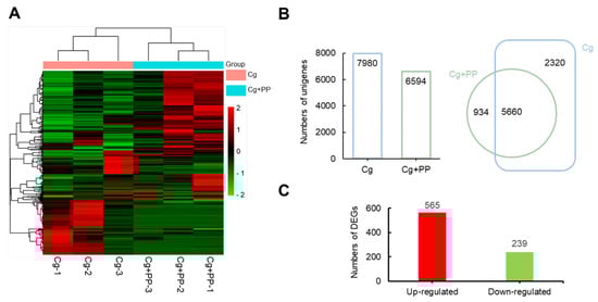 Transcriptional profiles of stylo leaves in response to Cg and Cg + PP treatments. (A) Heatmap of the hierarchical cluster analysis of DEGs across all three samples with different treatments. Scale for levels of expression is indicated on the right side of the cluster analysis, ranging from low (green) to high (red), covering an ascending log10. (B) Statistics of unigenes (RPKM > 0) identified under different treatments. (C) Statistics of DEGs in Cg + PP as compared to Cg.