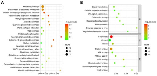 The KEGG pathway enrichment analysis revealed that the enriched DEGs belonged to 22 different KEGG pathways (Figure 3A). DEGs were mainly enriched in metabolic pathways and secondary metabolite synthesis pathways, which were mainly related to oxidative stress and chloroplast organization (Figure 3A, Table S3). Gene ontology (GO) analysis of the DEGs showed that the DEGs were mainly enriched in signaling transduction (GO:0007165), defense response to fungi (GO:0050832), chloroplast organization (GO:0009658), calmodulin binding (GO:0005516), and response to salicylic acid (GO:0009751) (Figure 3B, Table S3).