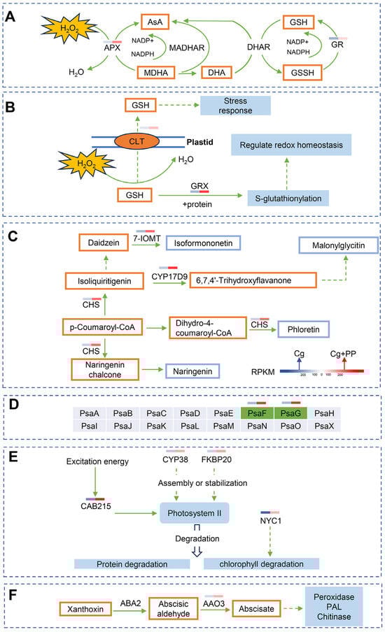 Both KEGG and GO analysis suggested that redox homeostasis and chloroplast may play important roles in the molecular responses of stylo caused by PP treatment against C. gloeosporioides infection. We further analyzed the expression levels of genes involved in production of antioxidant and chloroplast organization (Figure 4, Table S4). Two DEGs involved in AsA-GSH cycle, including ascorbate peroxidase (APX) and glutathione reductase (GR), were identified. The expression of APX1 was up-regulated in Cg + PP-treated group, while the expression of GR was down-regulated. Two DEGs related to GSH homeostasis and GSH-dependent redox regulation were identified. One was CLT, encoding a CRT-like transporter required for GSH homeostasis, and another was GRX2, encoding glutaredoxin, catalyzing GSH-dependent redox regulation via glutathionylation. The expression levels of both CLT2 and GRX2 were up-regulated in Cg + PP. Three DEGs involved in flavonoid biosynthesis, including CHS, 7-IOMT and CYP17D9, were up-regulated in Cg + PP. A total of six DEGs associated with chloroplast organization were identified. Four genes involved in assembly and stabilization of photosystem I and II, including psaF, psaG, CYP38 and FKBP20, were up-regulated in Cg + PP. The gene CAB215, which participated in energy transfer in photosystem II, was also up-regulated. The gene NYC1, which encodes chlorophyll catabolic enzymes and is involved in chlorophyll b degradation, was down-regulated. In the carotenoid metabolic pathway, one DEG AAO3, encoding an abscisic aldehyde oxidase, was identified as an up-regulated gene in Cg + PP. Altogether, these results suggest that PP treatment increases the production of antioxidants and protects the chloroplast organization of stylo in response to C. gloeosporioides infection.