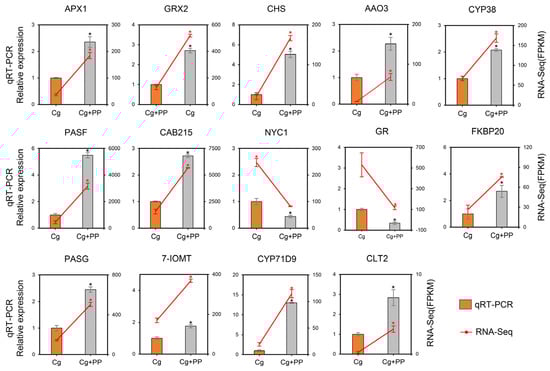 Validation of DEG expression by qRT-PCR. Expression levels of DEGs were normalized based on transcript levels of UBCE1 gene. Columns represent the qRT-PCR results, and the line chart represents the RNA-Seq data. The asterisk “*” represents significant difference between Cg and Cg + PP according to Student’s t-test at p < 0.05. Data were pooled from three biological replicates.