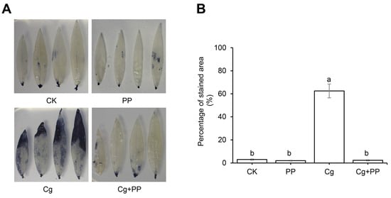 The accumulation of ROS in the leaves of stylo under different treatments. (A) NBT staining of leaves. (B) Statistics of percentage of staining area. The leaf samples were collected at 72 hpi. CK, uninoculated samples; PP, uninoculated samples treated with phloretin and pterostilbene; Cg, samples inoculated with C. gloeosporioides; Cg + PP, samples inoculated with C. gloeosporioides together treated with phloretin and pterostilbene. Data were the mean ± SD of three biological replicates. Values with different letters are significantly different according to ANOVA (p < 0.05).