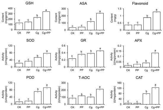 Both transcriptome and qPCR analysis suggested that PP treatment may increase the production of antioxidants in stylo in response to C. gloeosporioides infection. We first examined the effects of PP treatment on the accumulation of ROS in response to C. gloeosporioides infection. The staining of O2•− showed that C. gloeosporioides inoculation could induce a large amount of O2•− accumulation in stylo leaves, and Cg + PP treatment could significantly reduce the content of O2•− in the inoculated leaves, indicating the increase in antioxidant capacity induced by PP treatment (Figure 6). Therefore, we evaluated the content of antioxidant substances and the enzyme activities of antioxidant enzymes in leaves treated with PP, Cg and Cg + PP as compared to the uninoculated control (CK). As shown in Figure 7, the contents of GSH, AsA and flavonoids in PP-treated leaves were not significantly different from those in the CK. Compared with CK and PP-treated leaves, the contents of GSH, AsA and flavonoids were increased in Cg-treated and Cg + PP-treated leaves. The GSH, AsA, and flavonoid contents in the Cg + PP-treated leaves were 1.46-fold, 1.95-fold and 1.45-fold higher than in the Cg, respectively. For antioxidant enzyme activities, we examined the activities of the total antioxidant capacity (T-AOC), superoxide dismutase (SOD), catalase (CAT), glutathione reductase (GR) and peroxidase (POD) and ascorbate peroxidase (APX). The results showed that PP treatment had significantly increased T-AOC, GR, APX, and SOD activity compared to the CK, and the activities of POD and CAT were not altered by PP treatment. Both Cg and Cg + PP treatment increased the activities of all these enzymes, and enzyme activities of SOD, GR, APX, POD, T-AOC, CAT in Cg + PP-treated leaves were 1.42-fold, 1.18-fold, 3.30-fold, 1.30-fold, 2.05-fold, and 1.57-fold higher than those in Cg. These physiological results were consistent with the transcriptional results, suggesting that PP treatment could enhance the antioxidant capacity of stylo after inoculation with C. gloeosporioides.
