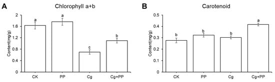 Many DEGS related to chloroplast organization were identified in the transcriptome; we therefore examined the contents of chlorophyll a + b and carotenoid in leaves under different treatments (Figure 8). After inoculation with C. gloeosporioides, the contents of chlorophyll a + b were reduced both in Cg + PP and Cg compared with CK, while PP reduced the decline of chlorophyll a + b content caused by C. gloeosporioides infection (Figure 8A). Treatments with PP and Cg only did not significantly affect the content of the carotenoid compared to that in the CK, and the carotenoid content in Cg + PP was 1.37-fold higher than that in the Cg (Figure 8B). These results were consistent with the general up-regulation of expression levels of genes related to chloroplast assembly and stablization in Cg + PP treatments compared to Cg treatment, indicating that PP could alleviate the damage of chlorophyll by C. gloeosporioides and increase the content of the antioxidant pigment carotenoid.