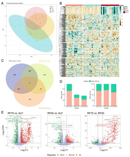 Multifaceted transcriptomic analysis of compensatory growth in Huaxi cattle under different feeding restrictions. (A) Principal component analysis (PCA) depicting the distribution of samples among three experimental groups. (B) Heatmap of the top 1000 genes with the highest standard deviation in expression across all groups. (C) Venn diagram illustrating the overlap of differentially expressed genes (DEGs) among the three comparative groups, highlighting shared and unique gene expression changes. (D) Bar plots showing the number of DEGs (left) and the relative proportion of up- and down-regulated DEGs (right) identified in the specified comparative groups. (E) Volcano plots representing the distribution of DEGs in the RF75 vs. ALF (left), RF50 vs. ALF (middle), and RF75 vs. RF50 (right) comparative groups, with points colored to indicate up-regulation (red), down-regulation (green), or no significant change (grey-blue).